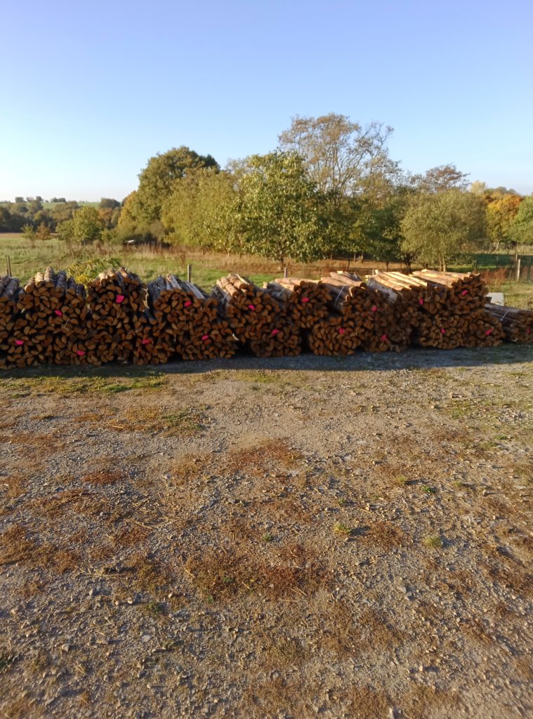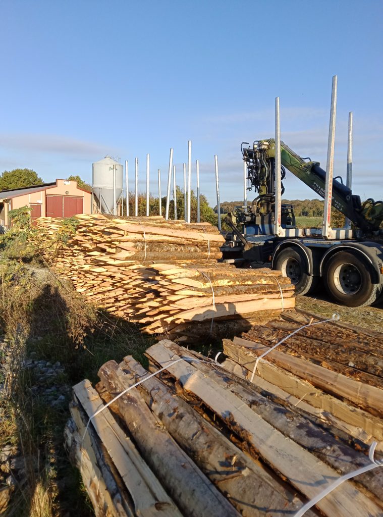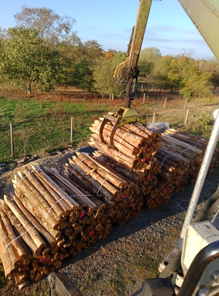 C’est une livraison de piquets ronds en châtaignier, diamètre 11/14cm Lg 2m, fagotés en 25ut.