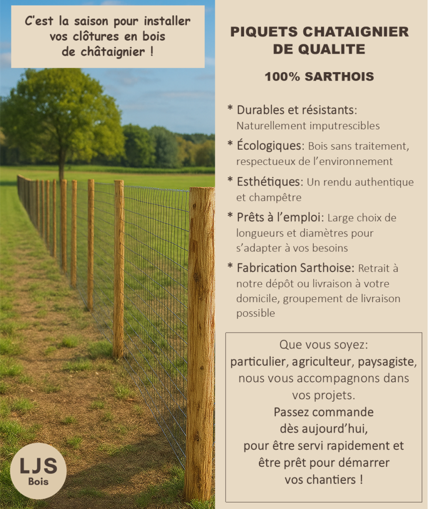Merci à la Sté AGOR, ils ont réalisé du beau travail sur la voie verte de Bessé/Braye (72), pose de clôture de protection: Ganivelle Ht 1m, piquets écorcés en châtaignier: diam. 8/11cm, Lg 2m et traverses châtaignier, brutes de sciage: Lg 3m x 10cm x 2.7cm.